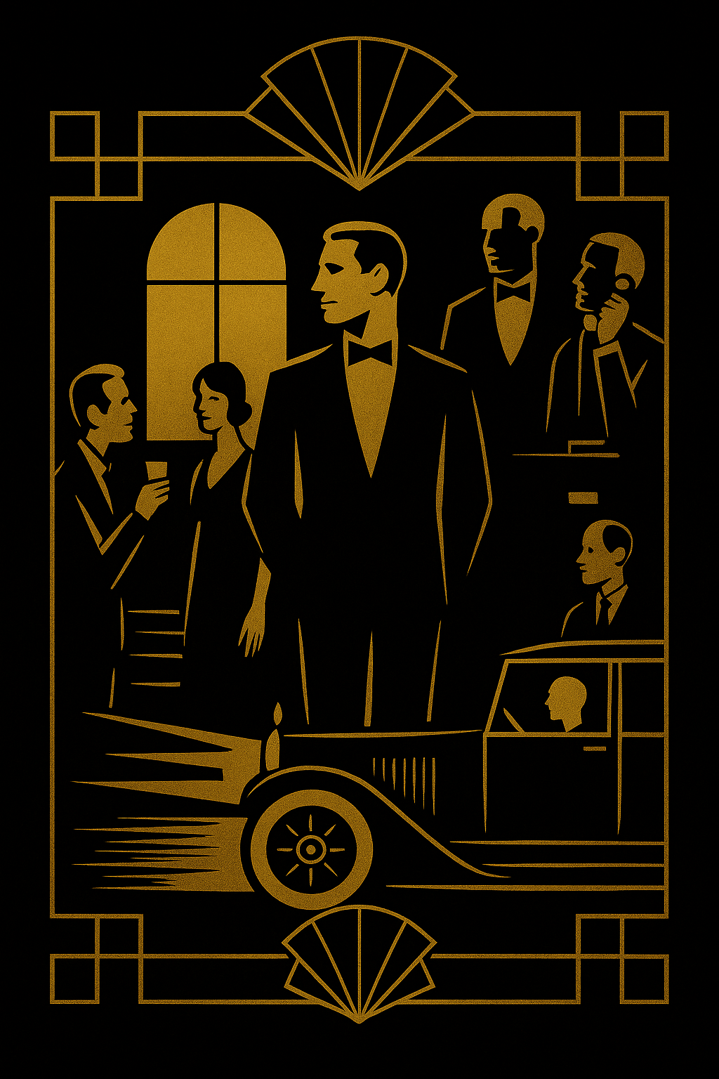 Dressed up in white flannels I went over to his lawn a little after seven, and wandered around rather ill at ease among swirls and eddies of people I didn't know — though here and there was a face I had noticed on the commuting train. I was immediately struck by the number of young Englishmen dotted about; all well dressed, all looking a little hungry, and all talking in low, earnest voices to solid and prosperous Americans. I was sure that they were selling something: bonds or insurance or automobiles. They were at least agonizingly aware of the easy money in the vicinity and convinced that it was theirs for a few words in the right key.
